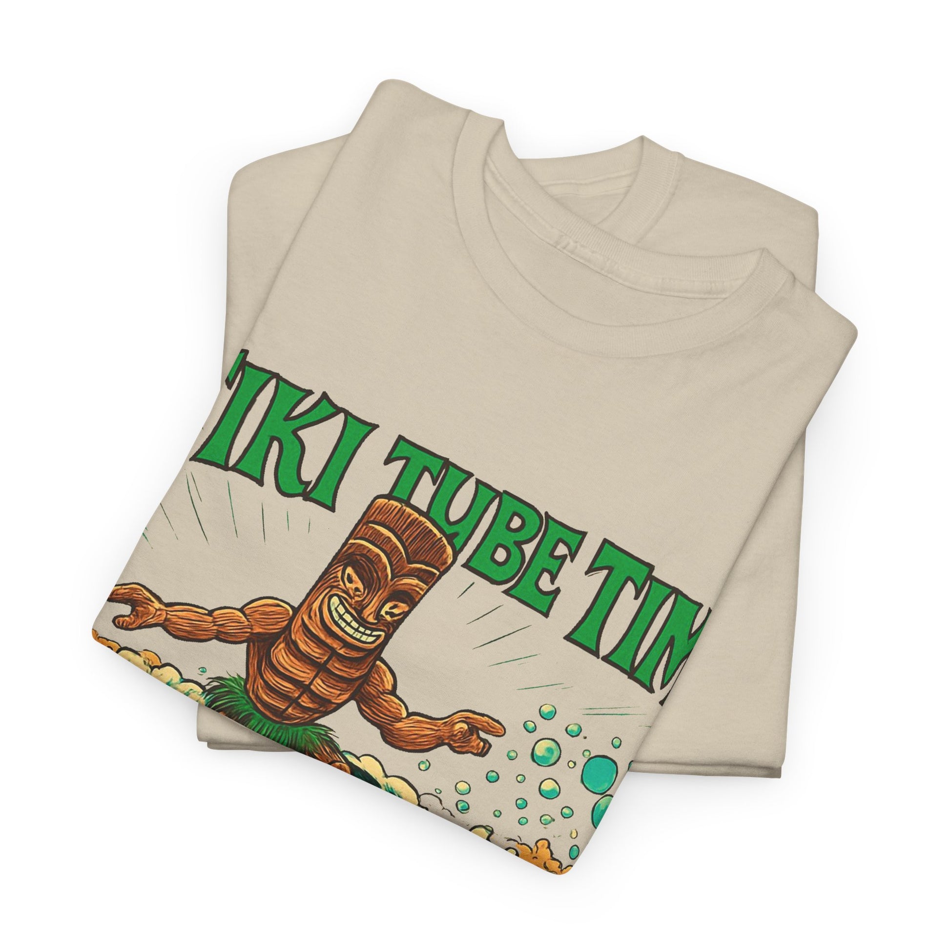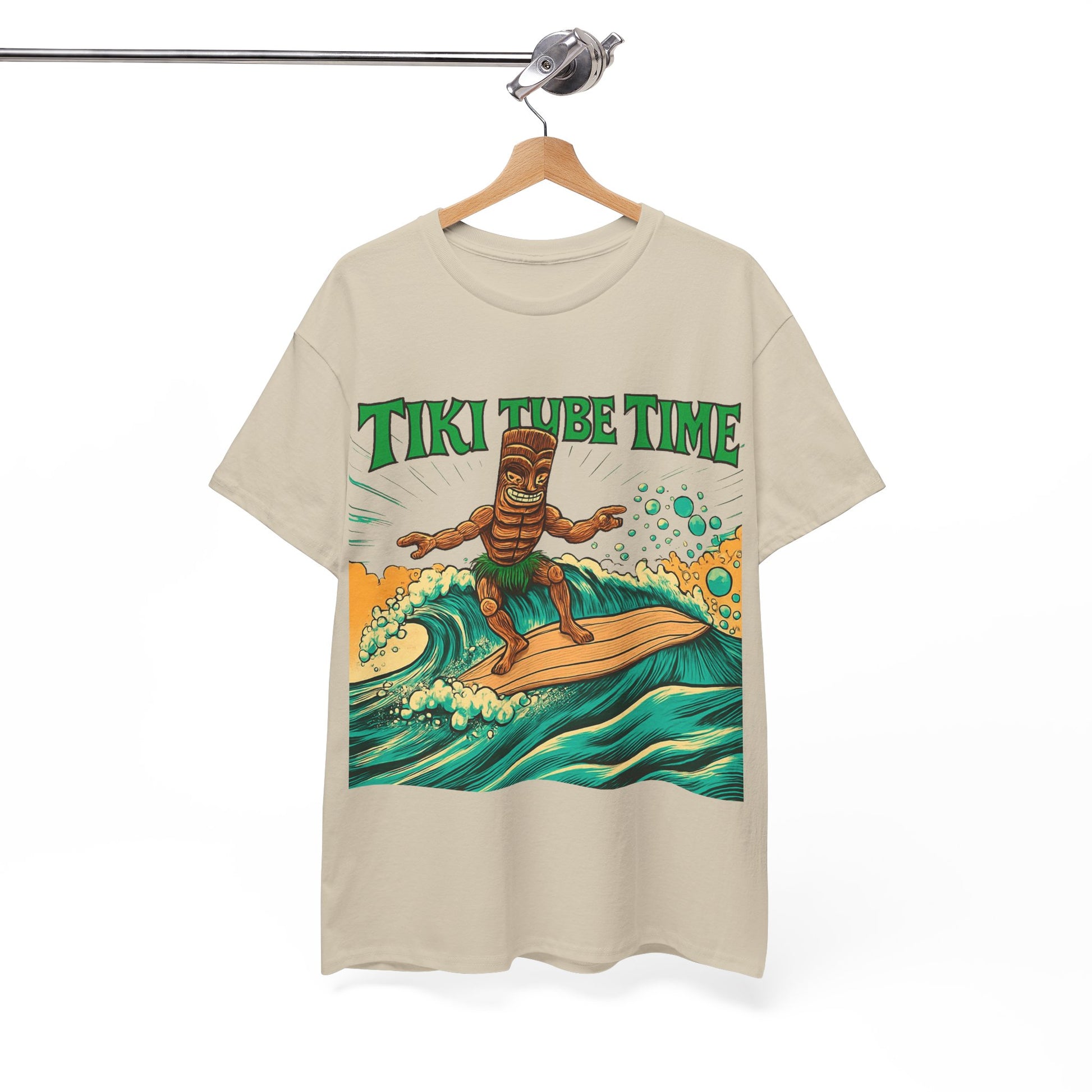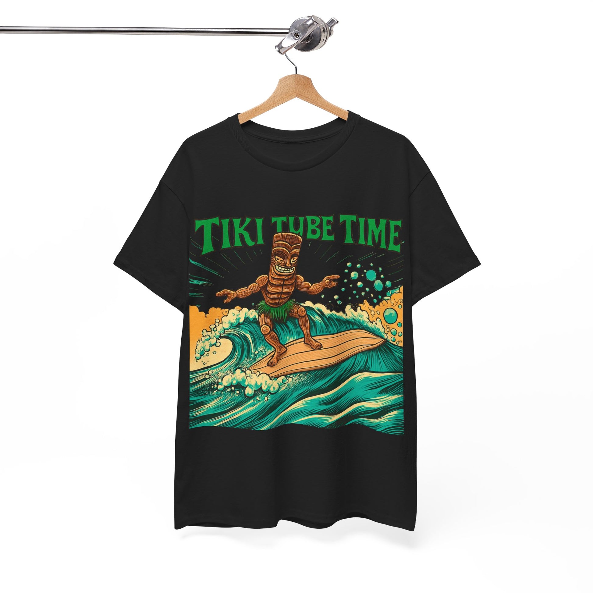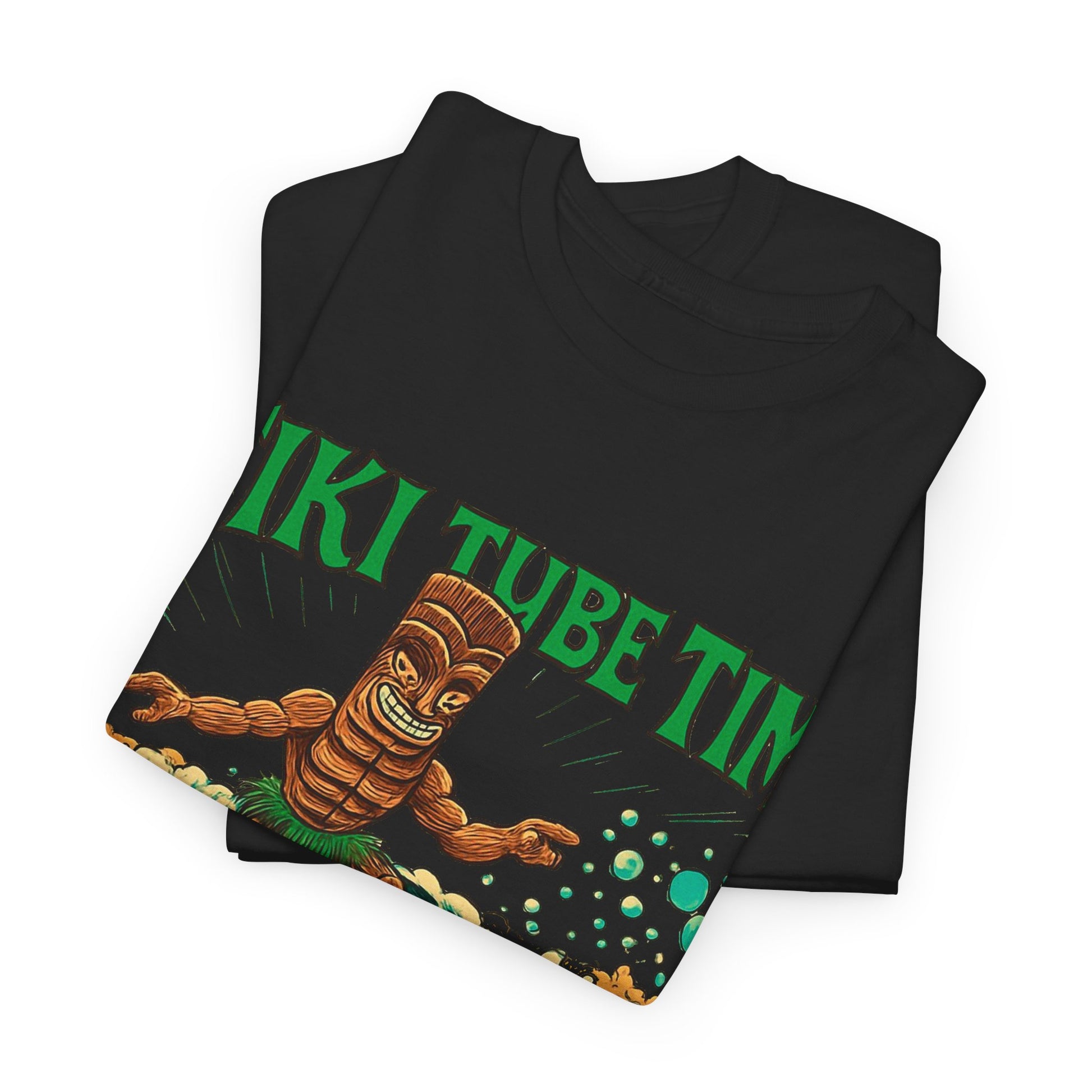 Retro Tiki happily surfing a tube design on a Kustom Kulture Tiki Tube Time T-shirt. This unisex heavy cotton tee is perfect for those who love vintage vibes and unique, eye-catching graphics. Ideal for tiki enthusiasts and retro lovers, this shirt is great for casual wear or special events, making it a fun addition to your wardrobe.