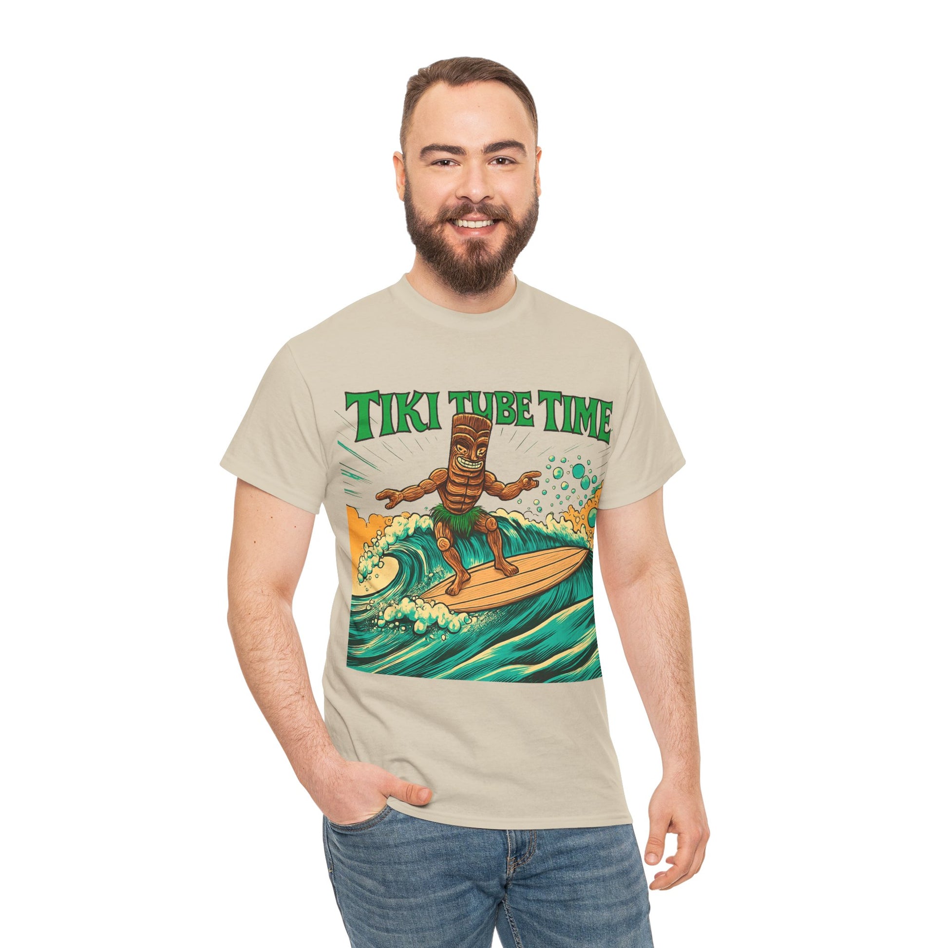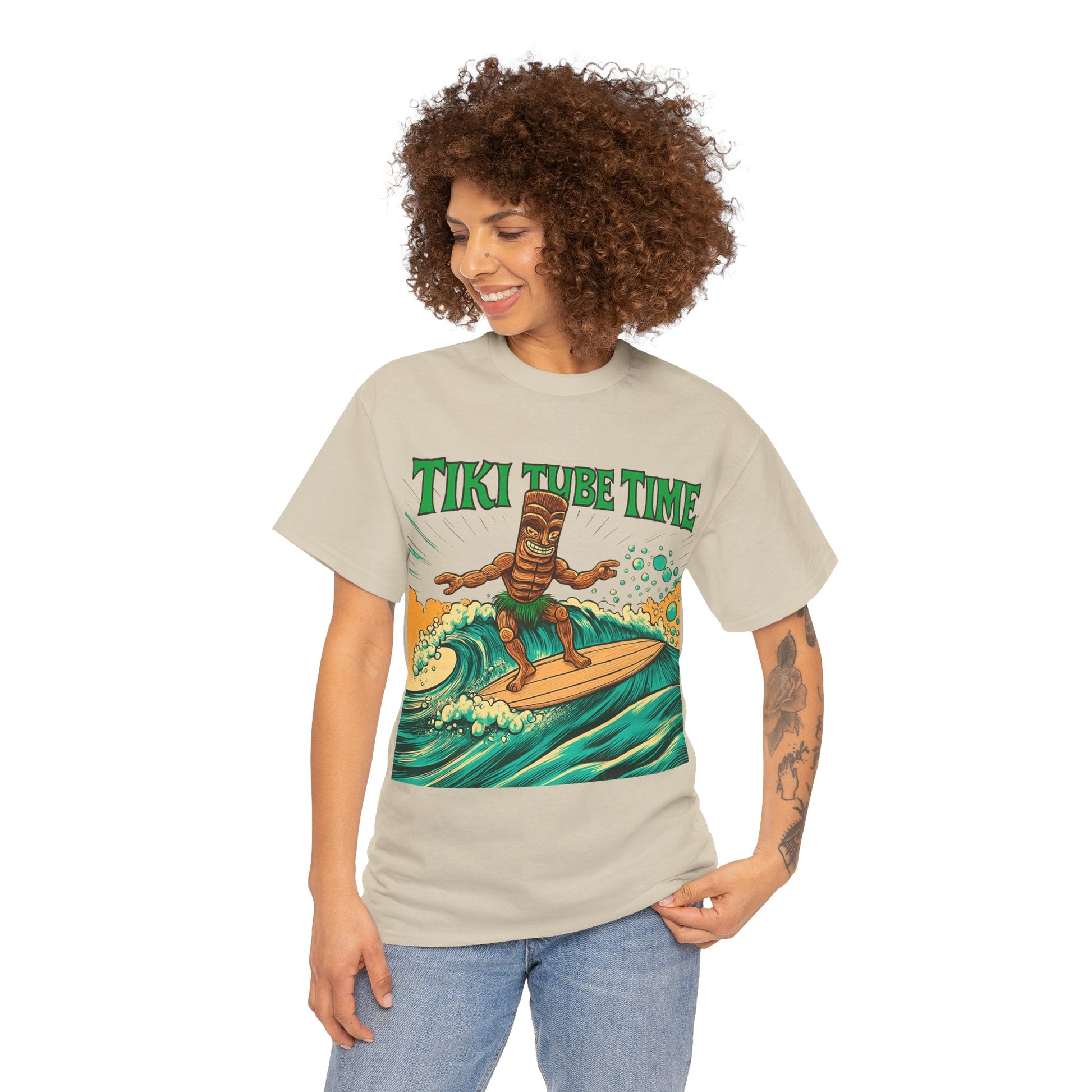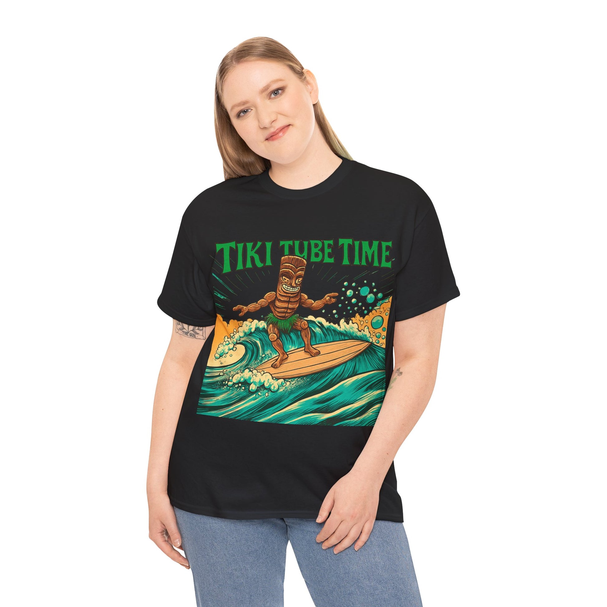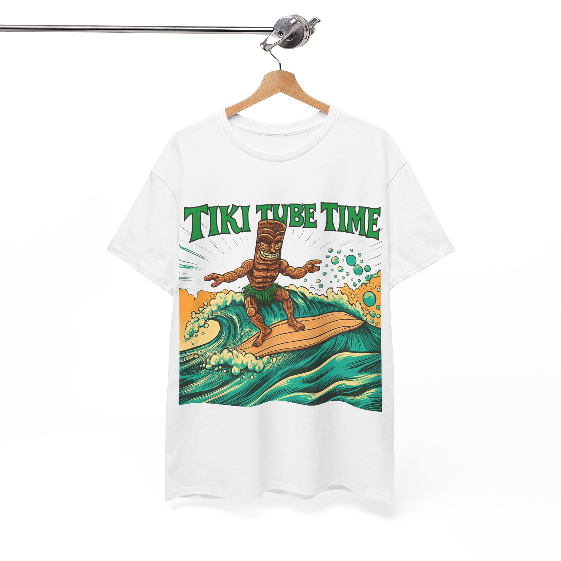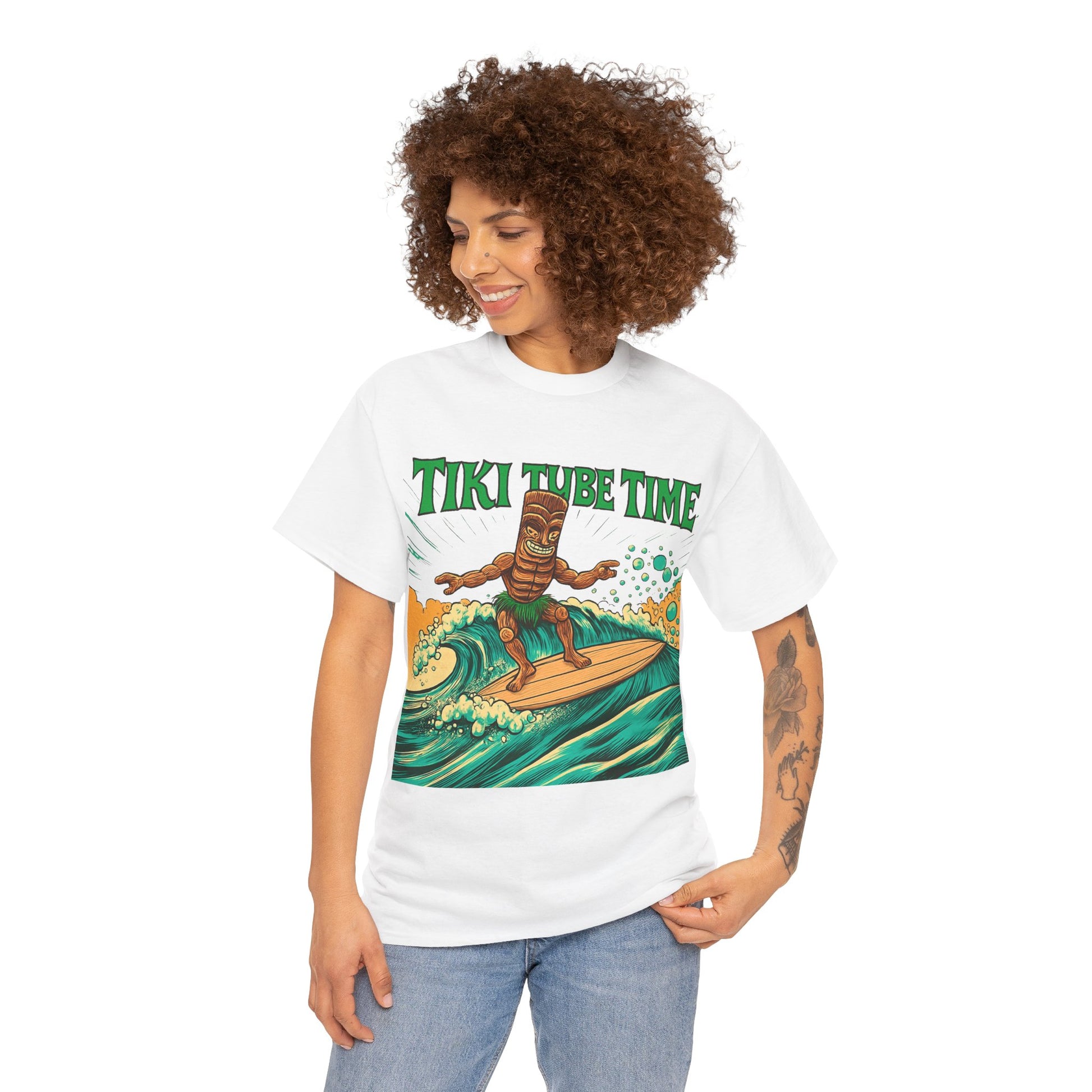 Retro Tiki happily surfing a tube design on a Kustom Kulture Tiki Tube Time T-shirt. This unisex heavy cotton tee is perfect for those who love vintage vibes and unique, eye-catching graphics. Ideal for tiki enthusiasts and retro lovers, this shirt is great for casual wear or special events, making it a fun addition to your wardrobe.