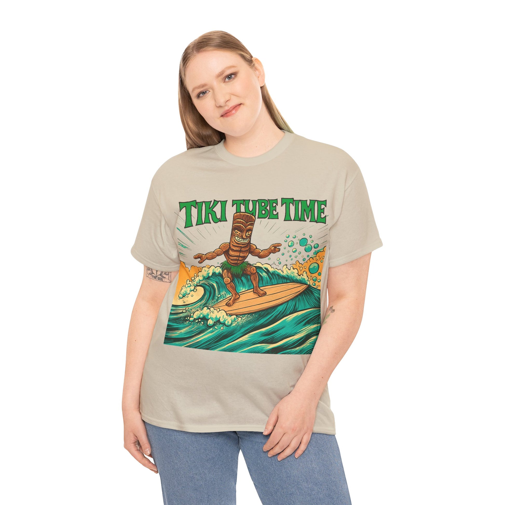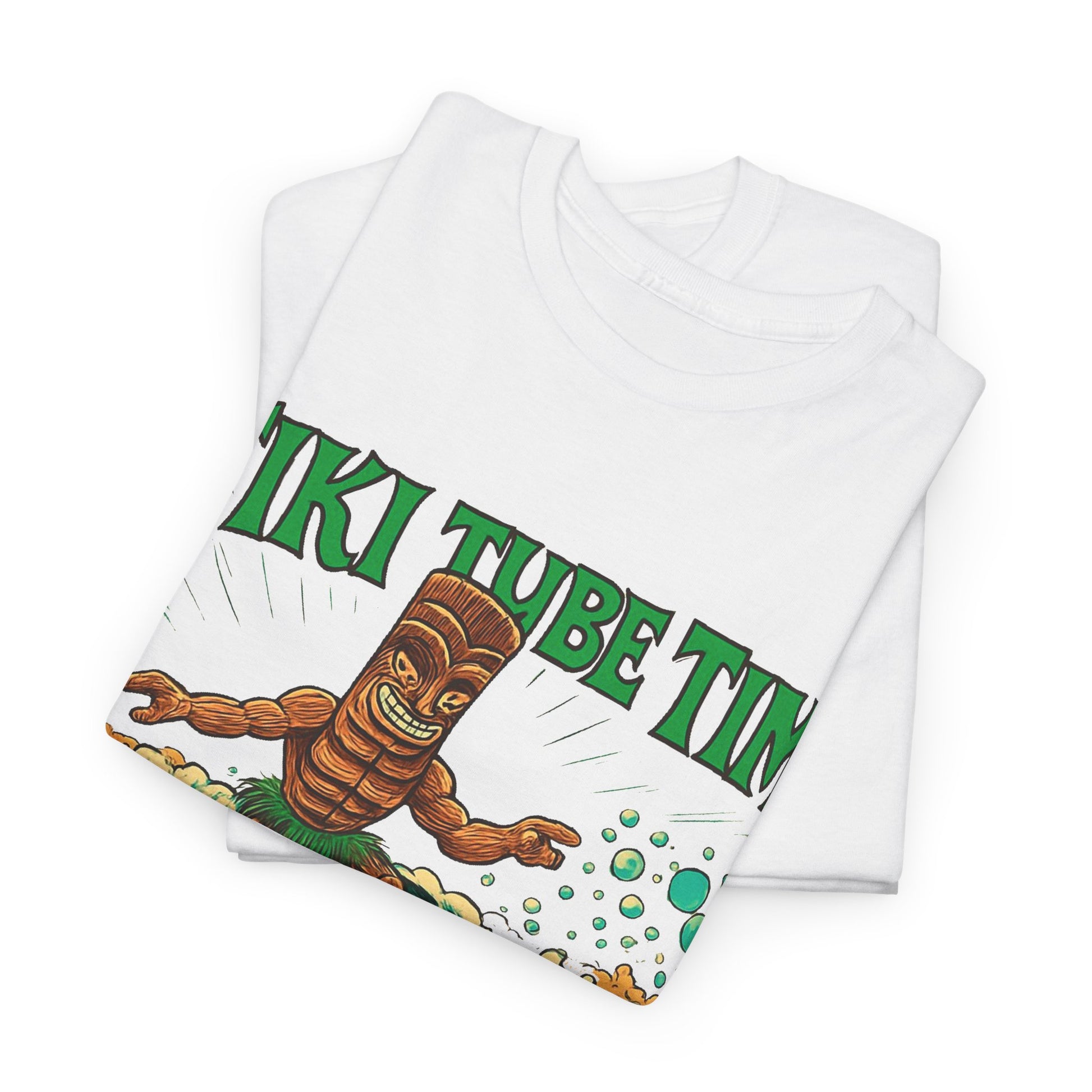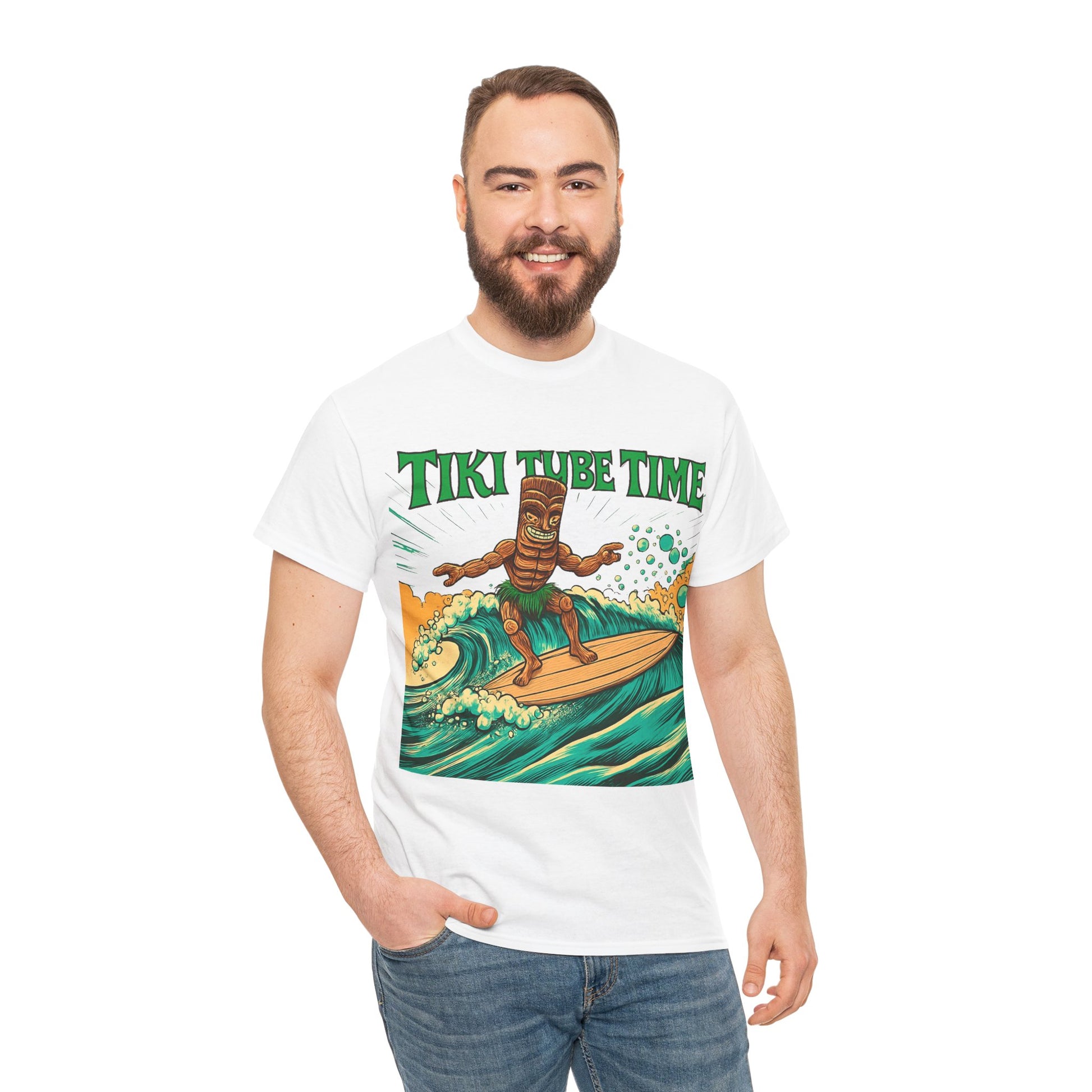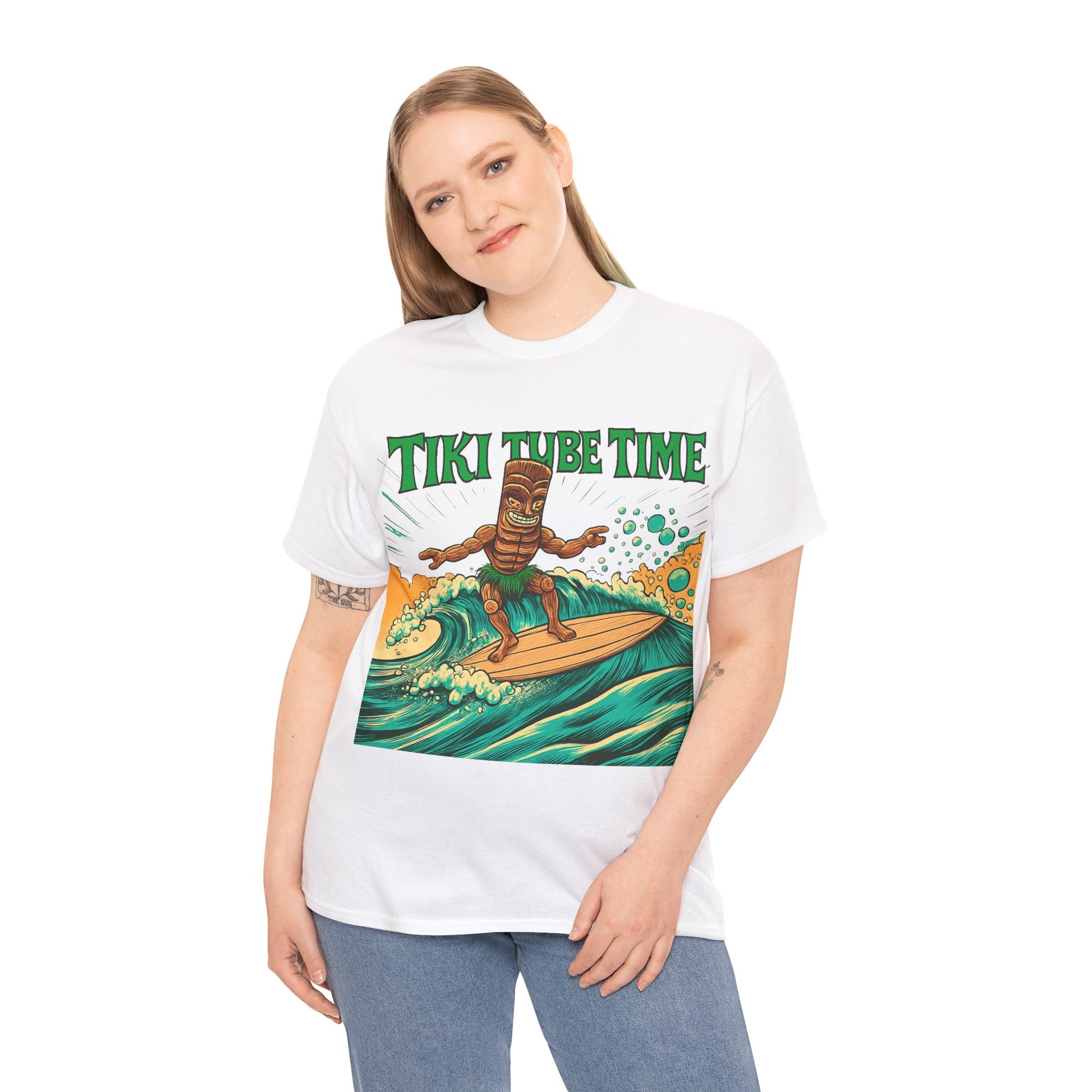 Retro Tiki happily surfing a tube design on a Kustom Kulture Tiki Tube Time T-shirt. This unisex heavy cotton tee is perfect for those who love vintage vibes and unique, eye-catching graphics. Ideal for tiki enthusiasts and retro lovers, this shirt is great for casual wear or special events, making it a fun addition to your wardrobe.